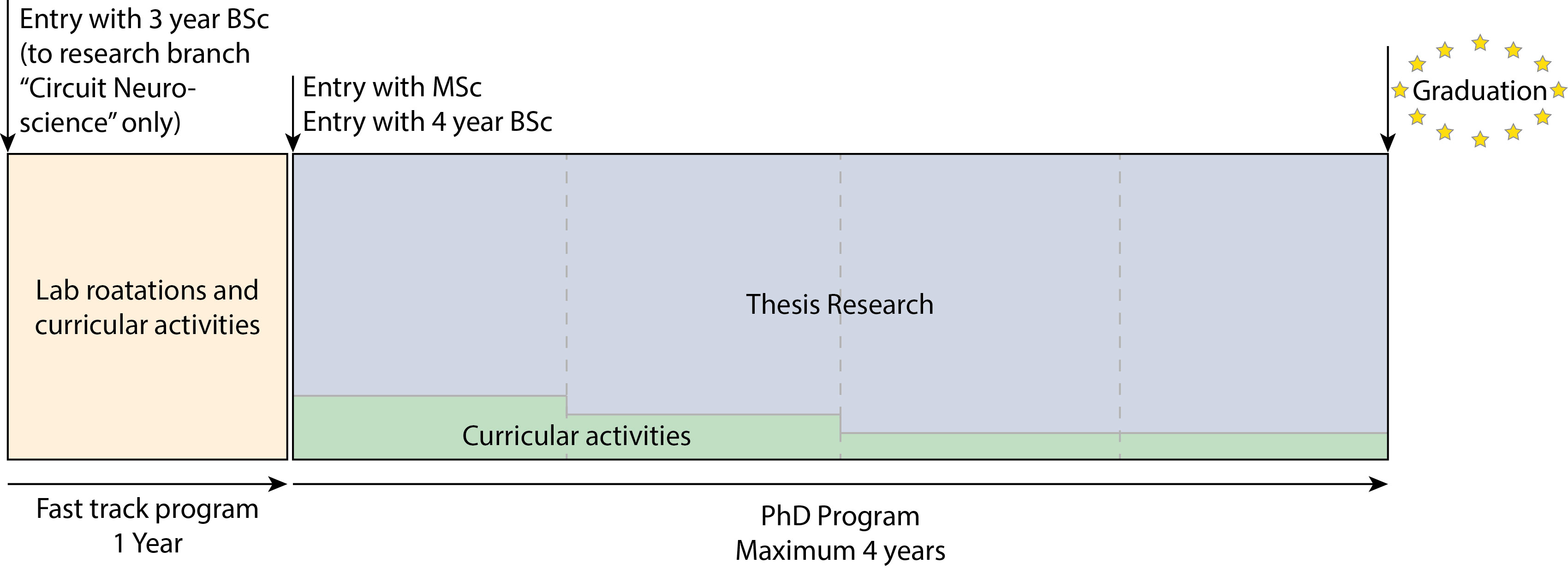 Applicants with a three-year BSc degree (equivalent to 180 ECTS credits) typically are not eligible to apply directly for doctoral studies, unless they intend to join a research group that is affiliated with the school's research branch "Circuit Neuroscience". In that case, a cooperation with the LMU-Graduate School of Systemic Neurosciences will allow enrollment as doctoral student (and joint affiliation with both PhD programs). The so-called Fast track program includes an intense additional year comprised of lectures, courses, practicals and lab-rotations. The goal is to bring fast track students up to the level of MSc students within the first year of studies. PhD thesis research will commence in the second year.